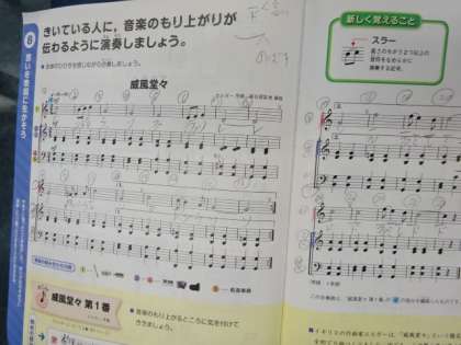 「威風堂々」を聞いています。曲の盛り上がりが伝わるように演奏しましょう!できるかなあ。