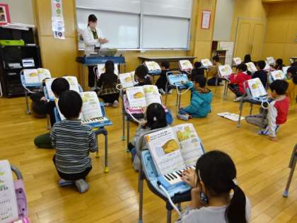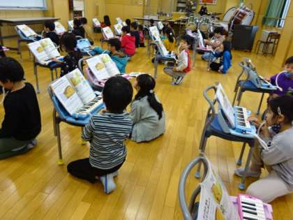 みんなそろって、鍵盤ハーモニカの練習をしています。