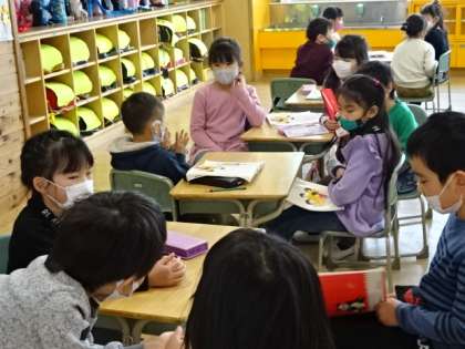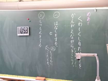 「詳しく知りたいことを考えながら聞こう」という目当て、友達の発表を聞いています。