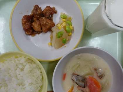 ごはん、牛乳、豚肉の梅ソースかけ、枝豆サラダ、鮭の米粉シチューでした。