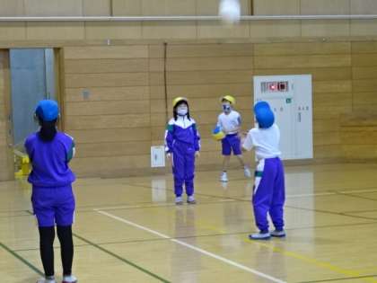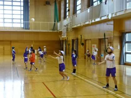 ボール運動です。いろいろな投げ方とキャッチの仕方の練習をしています。