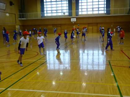 ボール運動です。いろいろな投げ方とキャッチの仕方の練習をしています。