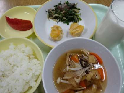 ごはん、牛乳、にんじんシューマイ、レバニラ炒め、きのこ汁、りんごでした。