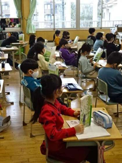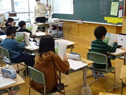 音読は、まず姿勢から。「スーホの白い馬」を音読しています。