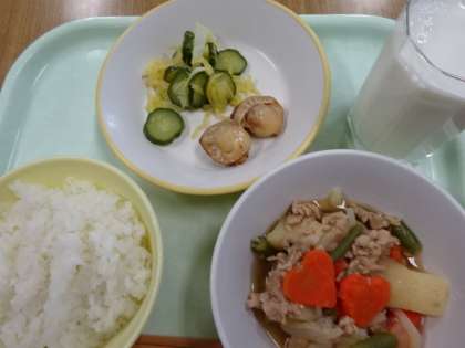 ごはん、牛乳、ほたてのバターしょうゆ焼き、あわせ和え、肉じゃがでした。ハートのにんじんが入っていたらラッキーです。