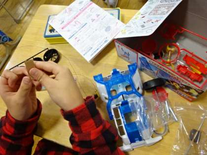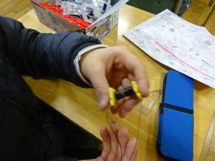 50回巻きのコイルを作っています。これに電池をつなげば、電磁石ができるはず・・・