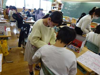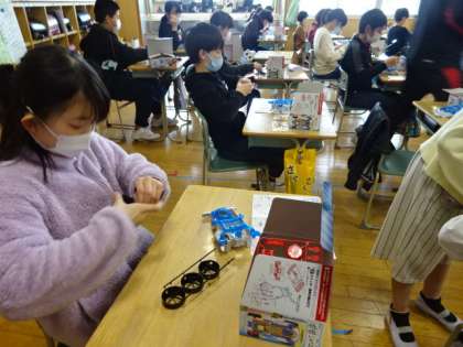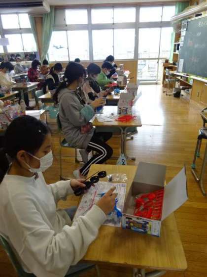 電磁石を使ったものづくりです。説明書を見ながらつくっていますが、なかなか大変です。お互いに教え合いながらつくっています。