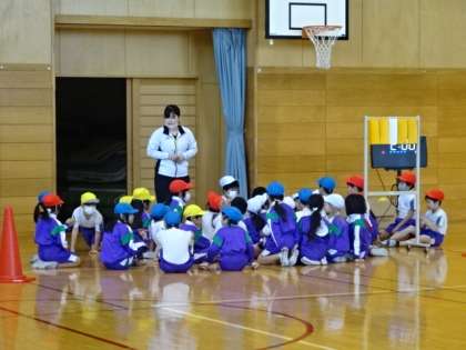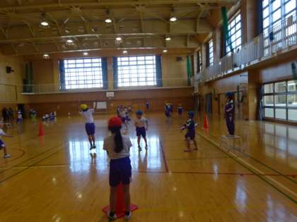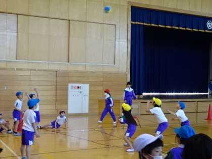 だんだん広いコートになってきました。体育館半分を使ってゲームをしています。