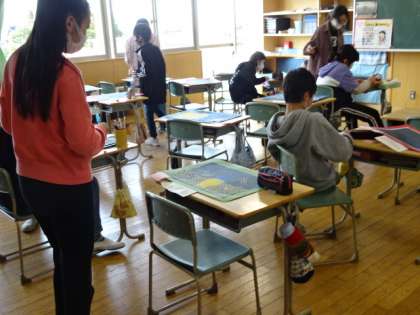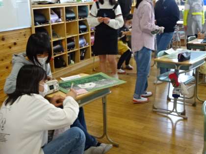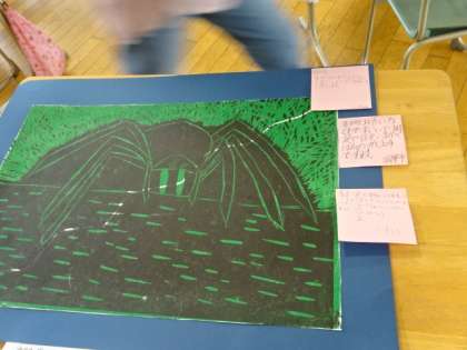 鑑賞の時間。友達の作品を見て、よいところを付箋に書いて貼っていきます。