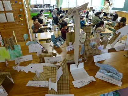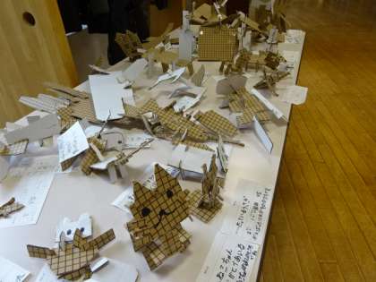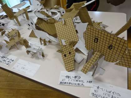 段ボールでつくった動物がたくさん集まっています。どんな動物がいるかな?