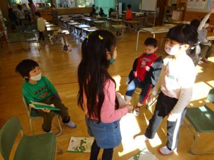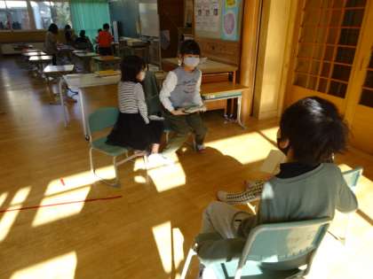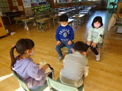 クイズを出して、それに答える練習をグループごとにしています。どんな問題を考えたのかな?
