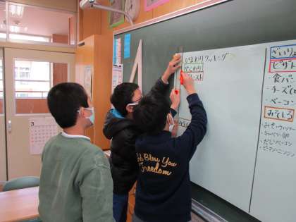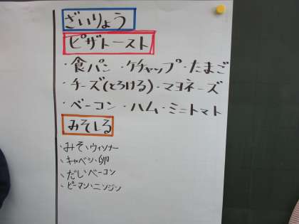 明日のひまわりクッキングに向けて、材料や役割を決めました。メニューは、ピザトーストとみそ汁です。「野菜を包丁で切る」「皿を洗う」など、子供たちは、様々な仕事を考え出しました。明日は、自分たちで考えた役割を担って、メニューの完成を目指します。明日が楽しみです。