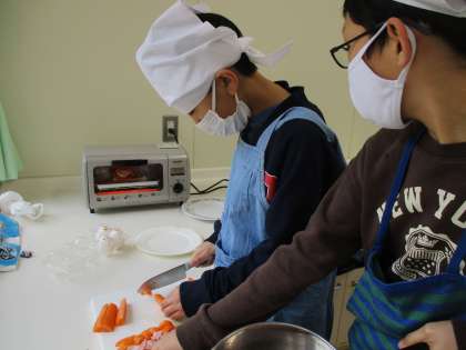 今日は、ひまわりクッキングの最終回でした。子供たちが考えたメニューである、ほかほかのピザトーストと具だくさんのみそ汁を作りました。どちらのメニューも作るのが2回目なので、手慣れたものでした。食パンに具材をのせたり、お湯に味噌を溶かしたりするのもスムーズに行っていました。出来たてを食べる子供たちは「美味しい!」と嬉しそうな笑顔を見せていました。楽しい時間を過ごすことができました。