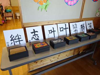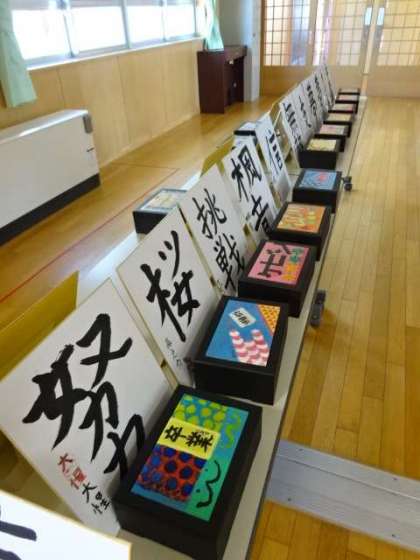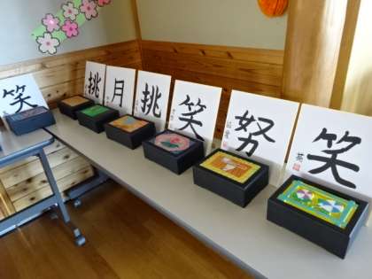 卒業作品のオルゴールと色紙が展示してあります。6年間の思いを込めて作成しました!
