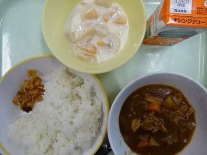 カレーライス、福神づけ、フルーツヨーグルト、オレンジジュースでした。