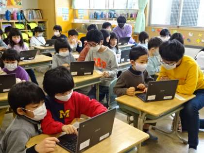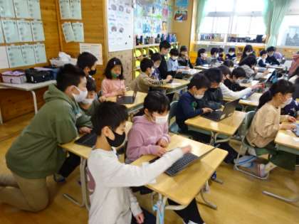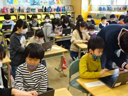 教室で、タブレット型パソコンの使い方を6年生からやさしく教えてもらいました。