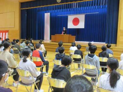 蘭秀同窓会の入会式を行いました。代表児童に記念品を授与した後、「蘭秀」のいわれの話を聞きました。