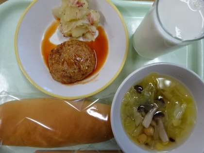 コッペパン、牛乳、ハンバーグのケチャップ煮、ジャーマンポテト、キャベツスープでした。6年生にとっては、小学校生活での最後の給食になります。