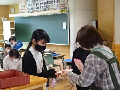 図書館司書の先生から6年生に、心のこもったメッセージカードが一人一人渡されました。うれしいサプライズです。