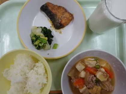 ごはん、牛乳、魚のえごま味噌かけ、白菜ひたし、厚揚げと豚肉の煮物でした。