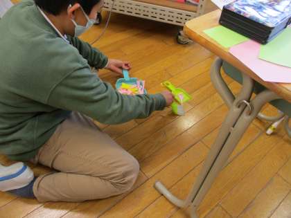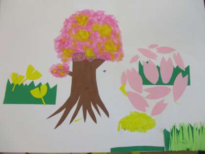 もう少しで桜が開花するので、ひまわり級でも春の作品を作りました。画用紙にお花紙や色画用紙を貼って、桜の花や菜の花を表現しました。工作が終わった後には、ちりとりと小ぼうきを使って、後片付けもしっかり行いました。ひまわり級の満開の桜や菜の花が完成しました!