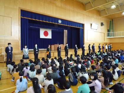 新任式が行われ、新任者の紹介が行われました。その後には、子供たちが楽しみにしていた担任発表を行いました。