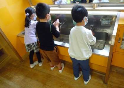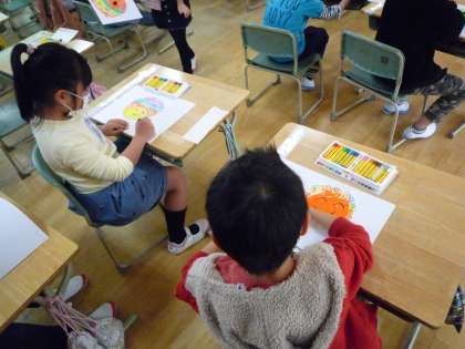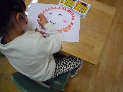 1年生は、にこにこお日さまを描きました。想像を膨らませて描きました。その後、しっかり手を洗いました。