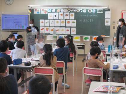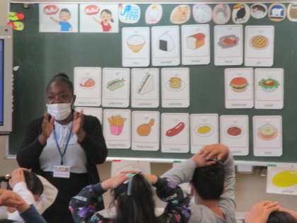 ALTと一緒に、レクリエーションゲームを楽しみながら、食べ物の英単語を正しく発音したり、聞き取ったりするトレーニングをしています。