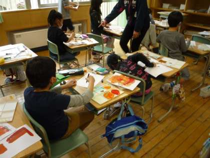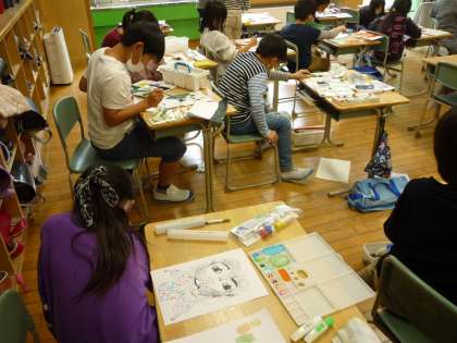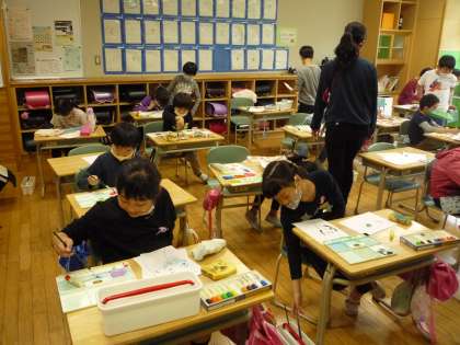 いろいろな色を使って自分の色を作り、顔の表情を表現しています。また、水の含ませ方等塗り方も工夫しています。