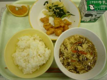 ごはん 鶏肉と高野豆腐のねぎソースかけ チンゲンサイおひたし 卵ともずくのスープ