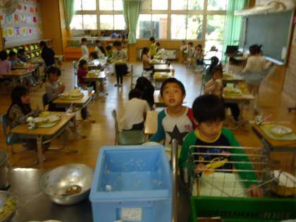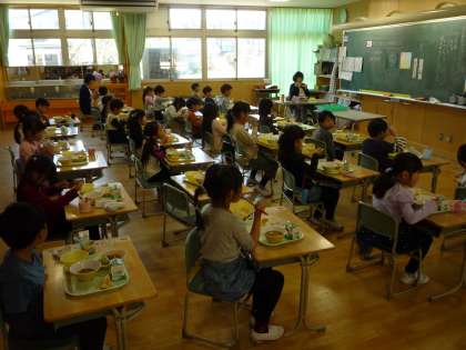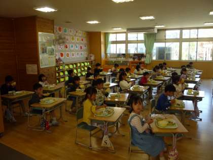 感染症対策のため、1年生も静かに食べています。とても行儀がいいです。