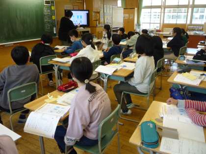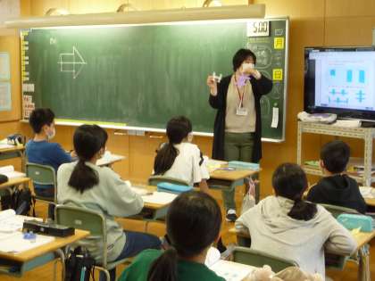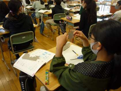 線対称の図形の学習では、実際に折り紙を切り抜いて、どこの点や線が重なり合うのかを調べています。
