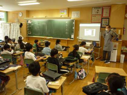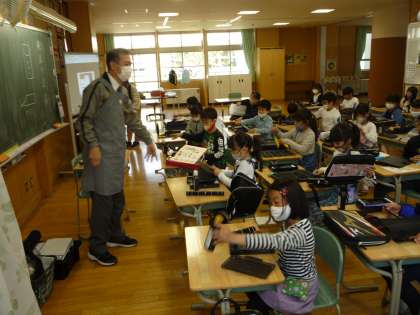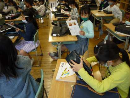 初めての書写に挑戦します。今日は、硯や下敷き、墨、お手本等の置き方を勉強しました。