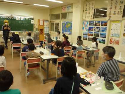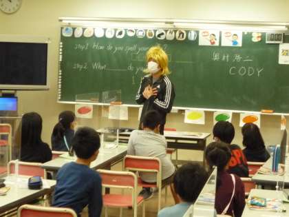今年度の取組みの一つ専科制です。高学年の外国語科を教務の先生が担当します。奥村先生に似たオッディー先生の登場に子供たちは大喜びです。
