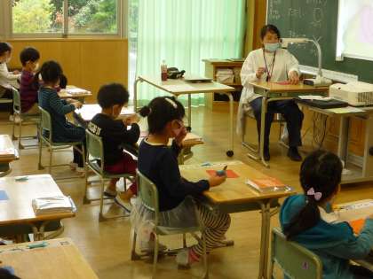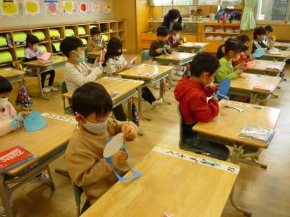 はさみを上手に使う練習です。折り紙にカタツムリの渦を描いて、それを丁寧に切り抜いていきます。みんな真剣です。