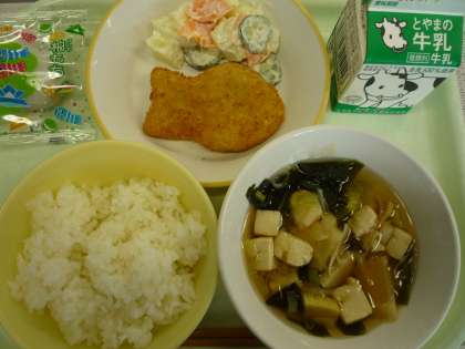 ごはん おさかなカツ ポテトサラダ 若竹汁 牛乳 かしわもち
