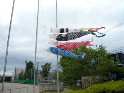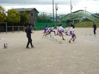 風の強い中、グラウンドでミニハードルを使っての短距離走の練習をしています。掲揚塔に揚げた鯉のぼりも子供たちに負けじと元気に泳いでます。(元気な蘭秀っ子になるように願いを込めて、鯉のぼりを揚げました。)