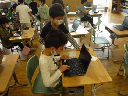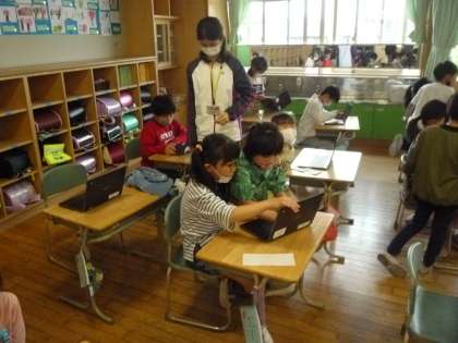 2年生の子供たちもタブレットを使った学習を始めました。まずは、ログインの仕方やパスワードの設定を行っています。得意な子が教えてあげる姿も見られました。