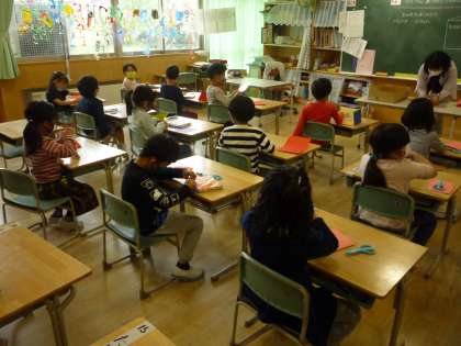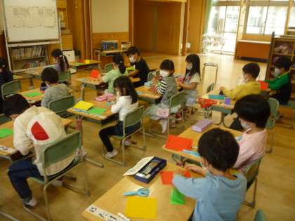 母の日のためのプレゼントを作っています。折り紙をはさみで切って、カーネーションの形になるよう頑張っています。