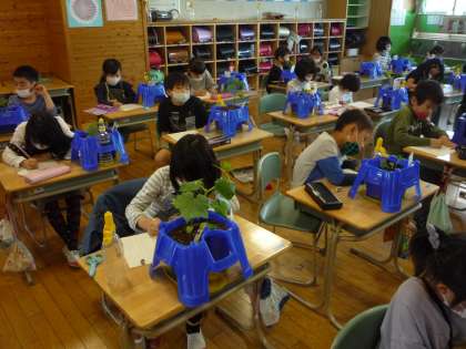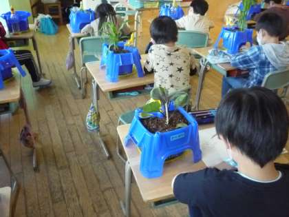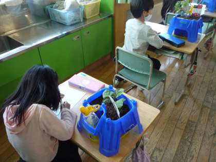 植えた野菜の苗を観察しました。葉の色や形など詳しく絵や文で書きました。