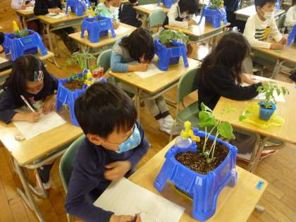 野菜の苗の観察です。葉の数や色、形など気付いたことやどんな風に育ってほしいのか観察カードに書いています。