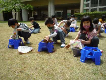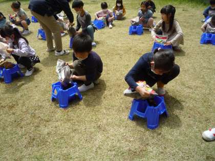 アサガオの種を植えました。鉢に土を入れ、「大きく育って!」と願いを込めて植えていました。