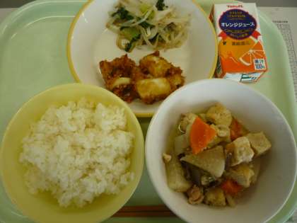 ごはん 豚肉と大根のごまみそ煮 いかのかりん揚げ もやしのおひたし オレンジジュース