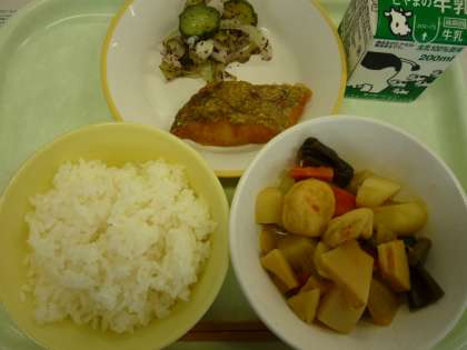 ごはん 魚のスタミナ揚げ(ニンニク風味) ゆかり和え 炊き合わせ 牛乳