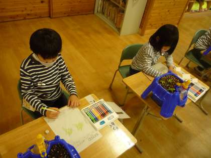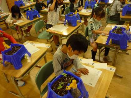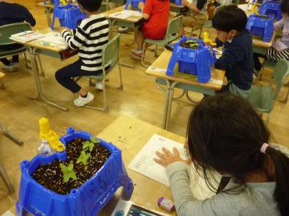 アサガオが芽を出しました。子供たちは大喜びで観察をしています。中にはまだ芽を出していない子供もいて、とても心配そうにしています。