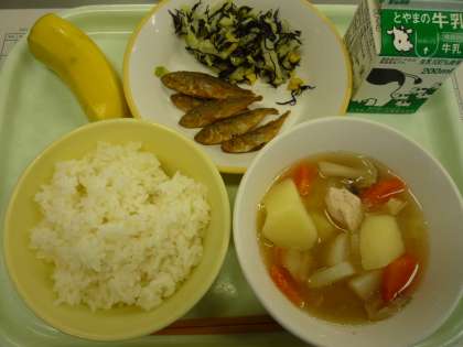 ごはん 小アジのから揚げ ひじきのマリネ ポトフ バナナ 牛乳