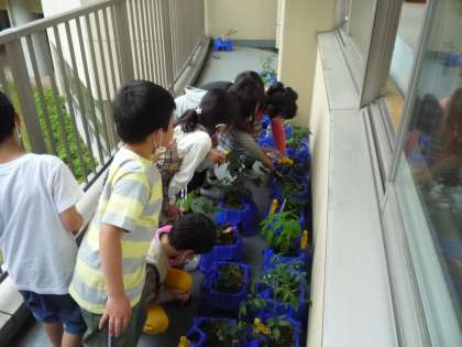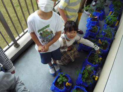 マイ野菜に大きく育てと水やりです。一緒に声もかけてあげています。