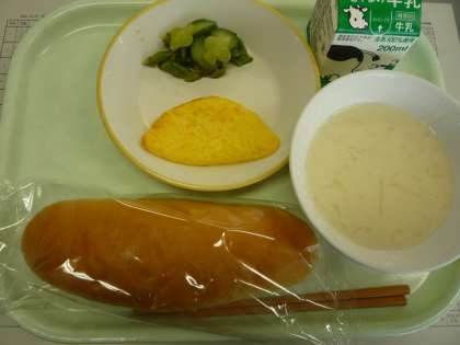 米粉コッペパン オムレツ グリーンサラダ ビーンズポタージュ 牛乳