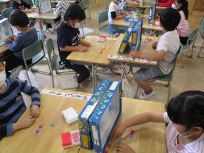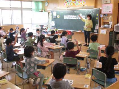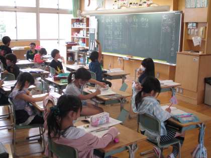 昨日の陸上競技会で力一杯走った子供たちですが、今日は学習に集中して取り組んでいます。低学年の算数の学習です。おはじきや数カードを使って学習している1年生と筆算に挑戦している2年生です。