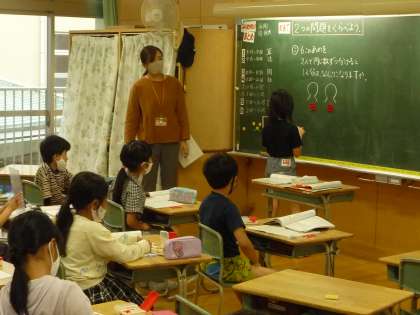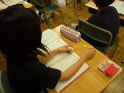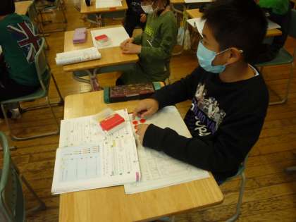 割り算の6÷2になる2つの問題の違いについて、おはじきを使って考えました。